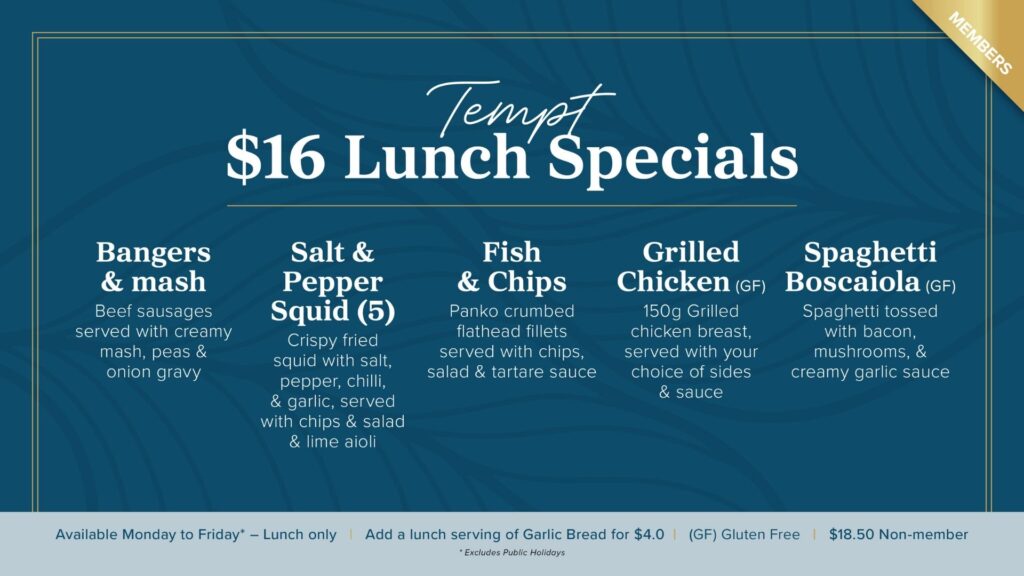 With its open planned and relaxed dining setting, Tempt is the perfect place to catch up with friends and family. Offering a great seasonal variety of modern Australian dishes, family favourites and a great kids menu, Tempt offers a delicious dining experience for everyone.